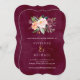 Este cartão de save the date de casamento elegante apresenta um fundo rico em burgundy, com flores de aquarela modernas em tons de marsala, rosa bege e laranja, com folhas verdes e um e comercial em dourado falso. (E comercial floral via www.createthecut.com)