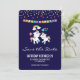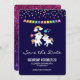 Um cartão plano salva a data com dois unicórnios bonitos com caudas brilhantes e coloridas, e mano. Um arco-íris colorido com nuvens em cada lado acima de suas cabeças. Outros elementos incluem uma pequena flor, um coração e algumas estrelas. Pontos de confete coloridos e uma imagem de banner de bunting ao longo do topo. Fundo roxo escuro.