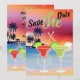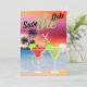 Este belo casamento salva a design de data mostra uma bela cena de praia com um pôr do sol vibrante sobre o oceano. Há duas Margaritas com palhetas cruzadas em frente ao fundo que incluem silhuetas encantadoras de palmeiras. Personalize facilmente com todas as suas informações.