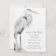 Este anúncio do casamento Save the Date apresenta um desenho de lápis com estilo desenhando de um belo Excelente Blue Heron sobre rochas com vista para a água. - por MI Wedding Designs