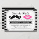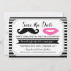 Esses bigodes e lábios temidos, salvem as datas... são muito bonitinhos! Os cartões apresentam bigode e lábios, caligrafia, tipografia moderna, bandeira de fita e quadro de ornamentado sobre um fundo de padrão de listras brancas e pretas.