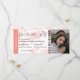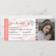 Bilhete de casamento de embarque com monograma moderno com um fundo branco e salmão simples, uma foto do casal noivo, um avião com uma trilha em loop e um modelo de save the date personalizado que é fácil de personalizar. Não se esqueça de atualizar o texto do monograma no verso.