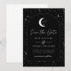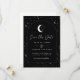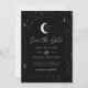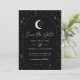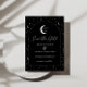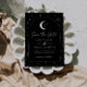 Um cartão de save the date com tema de lua e estrelas celestiais com fundo preto e texto branco com elementos. Personalize a cor do padrão de estrelas, fundo, preenchimento do arco e elemento da lua!
