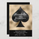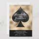 Este personalizado salva o anúncio de data com um tema de pôquer ou de jogo para um casamento em Las Vegas ou casino. Imagem de uma pá preta impressa no centro com fundo dourado. Duas amostras de nomes são impressas em toda a espada, com uma amostra de data de casamento impressa abaixo.