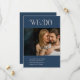 Casamento moderno salve o cartão de data apresentando um layout mínimo com "Nós fazemos" em tipografia ousada sobre sua foto de paisagem. A parte de trás tem uma foto de retrato junto com detalhes adicionais. Todos os elementos de design estão em azul e marfim marinho empoeirado e podem ser alterados na ferramenta de edição design. Esta simples, mas elegante, salva o cartão de data é excelente de um casamento informal ou formal.