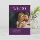 Casamento moderno salve o cartão de data apresentando um layout mínimo com "Nós fazemos" em tipografia ousada sobre sua foto de paisagem. A parte de trás tem uma foto de retrato junto com detalhes adicionais. Todos os elementos de design estão em ameixa roxa e marfim e podem ser alterados na ferramenta de edição de design. Esta simples, mas elegante, salva o cartão de data é excelente de um casamento informal ou formal.