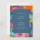 O convite para salvar a data apresenta um design floral em guache, com flores vibrantes, abstrato em pinks, roxas, blues e amarelos. Escovas velhas e texturas paintais criam um sentimento moderno e artístico.