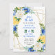 This beautiful and elegant save the date invitation features watercolor blue, yellow and white flowers with foliage on a gold geometric frame. The text combines handwritten script and serif fonts for a stylish and modern look. This is perfect for a spring or summer rustic wedding.