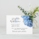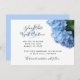 Cartões florais azuis salvos com o script moderno e fontes impressas. Uma flor azul-clara, realista de hydrangea com folhas verdes decora a borda dos cartões brancos. Os nomes estão no topo com um sinal azul claro "&" / e por trás do texto. Inclua a data, o local e uma linha que informa que um convite formal está sendo enviado. O reverso é azul claro sólido. Atualize o jornal para criar um anúncio de casamento extraordinariamente bonito.