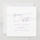 Esta foto de praça roxa empoeirada boho salva que o cartão é perfeito para um casamento minimalista. A lavanda da boêmia branca e roxa design com de luz apresenta uma caligrafia rustica simples com um estilo único, mas clássico. Personalize sua data de salvamento com seus nomes, data do casamento, local, foto do noivado e endereço do site do casamento.