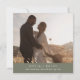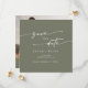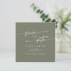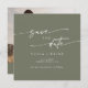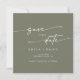 Esta foto do praça verde-oliva boho salva que o cartão é perfeito para um casamento minimalista. A design boêmica moderna de tom verde-escuro de madeira apresenta caligrafia rustica simples com um estilo único, mas clássico. Personalize sua data de salvamento com seus nomes, data do casamento, local, foto do noivado e endereço do site do casamento.