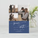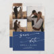 Este código de QR de fotos azul real e azul-real, salve o cartão de data é perfeito para um casamento minimalista. O ousado design boêmico azul escuro e moderno apresenta uma caligrafia rústica simples com um estilo único, mas clássico. Personalize sua data de salvamento com seus nomes, data de casamento, local, 4 fotos de noivado e um código de QR que liga ao seu site de casamento.