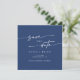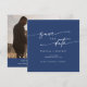 Esta foto azul-real do boho, salve o cartão de encontro é perfeito para um casamento minimalista. O ousado design boêmico azul escuro e moderno apresenta uma caligrafia rústica simples com um estilo único, mas clássico. Personalize sua data de salvamento com seus nomes, data do casamento, local, foto do noivado e endereço do site do casamento.