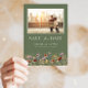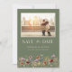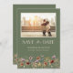 Sage Green Photo Boho Salvar A Data. Este casamento na moda e elegante salve a data com lindas flores de aquarela pintadas manualmente organizadas como um buquê adorável perfeito para primavera, verão ou casamentos outono. Encontre itens correspondentes na Coleção de Casamento de Bóvora Verde Sage.