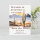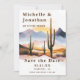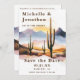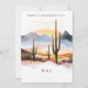 Anuncie seu casamento em estilo com este cacto do deserto de boho salve o cartão de data. Apresentando uma paisagem quente do deserto com aquarelas com cactos torrenciais e um pôr do sol ouro, este design dá o tom perfeito para um casamento rústico, ocidental ou com temas sudoeste. Personalize com seus nomes, data de casamento e local para criar uma manutenção única e memorável para seus convidados.