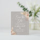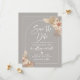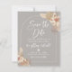 Cartão de Salve A Data de noivado em tons lindos de cinza, bege e branco com um design em arco e folhagem de grama pampas.