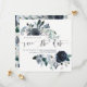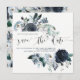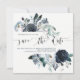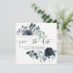 Esta moda e elegante casamento, exceto o cartão de data, apresenta flores de peônia azul-aquática de cor boho marinho com folhas, bagas e penas exuberantes. A frente do convite apresenta uma caligrafia na moda moderna junto com seus nomes, data de casamento e informações; sua foto pessoal está no fundo cercada por um quadro floral.