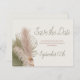 Rustic Salve o cartão Date com texto e data personalizados. O design é editável para qualquer ocasião e um par perfeito para os meus convites da quinceanera ocidental. Tem um estilo "boho" com um arranjo de aquarela de erva-campânula e folhas de palma secas.