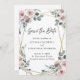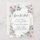 Poeira Boho Rosa Floral Rosas e Eucalipto Aquarela Folhagem Casamento Salve o Dia... Um visual boho chique para anunciar seu dia especial com estilo. Nosso cartão Save the Date apresenta arranjos de rosas cor-de-rosa empoeiradas e folhagens de eucalipto em uma moldura geométrica de folha metálica dourada. O verso do cartão contém uma mensagem pessoal e as informações do site do seu casamento. Todo o texto de exemplo (exceto o gráfico de texto Salve o Dia) pode ser facilmente revisado com suas próprias informações no modelo de personalização.