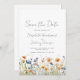 Este design de bico rústico apresenta uma borda de cor d'água de flores silvestres laranja e azuis ao longo do fundo. As palavras "Salvar a Data" e os nomes dos casais aparecem no script de escrita manual de cinzas de carvão na moda, com o texto restante na fonte sans serif em um fundo branco.