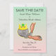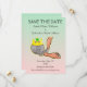 Bola e Cadeia Personalizáveis Salve a Data. Um design de desenho engraçado para um casal divertido. Uma perna de homem trancada com uma bola e uma corrente. A bola está vestindo uma tiara ouro com uma esmeralda verde enorme. O plano de fundo é um gradiente rosa-tendência. Você pode personalizar isso com seus próprios detalhes de celebração de casamento.