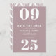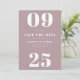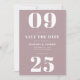 Elegante, moderno salve o cartão de data com sua data numérica de casamento em letras brancas em negrito contra um fundo roxo mauve. Personalize os cartões salve a data da moda adicionando seus nomes, data do casamento e local do casamento em letras brancas em negrito. A placa se inverte para apresentar um padrão cevon único desenhado à mão em roxo mauve contra fundo branco.