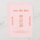 Casamento moderno salve o cartão de data com estilo ousado e tipográfico com "salve a data" no topo, um nome em cada lado e sua data no meio. Os detalhes do evento estão abaixo. O tema de cores do arco-íris (cor-de-rosa e laranja) e pode ser alterado na ferramenta de edição de design. Este estilo tropical casual salvar o cartão de data é excelente para um casamento informal de primavera ou verão.