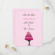 Um design elegante com um elegante bolo de casamento rosa com vários tons de flores cor-de-rosa no topo. Um assento de bolo preto e fitas pretas. Um fundo cor-de-rosa macio. Personalizar com nomes e data de casamento, conforme desejado.