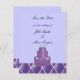 Um design clássico com um elegante bolo de casamento roxo com flores roxas e brancas no topo. Um fundo macio e uma borda de diamante. Personalizar com nomes e data de casamento, conforme desejado.