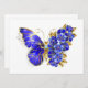 Borboleta de flores cinza, azul, safira, espumante com asa decorada com flores preciosos azuis com folhas de ouro sobre fundo branco.