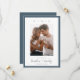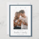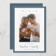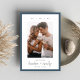 Um elegante e minimalista salva o design da placa de data apresentando uma foto vertical solteiro em um fundo branco com uma fina borda azul de ardósia. Personalize com sua data de casamento e sua localização em caracteres modernos de bloqueio, e seus nomes em chic, escrita manual casual. Personalize a parte de trás desta simples design com detalhes adicionais, como o seu site de casamento.