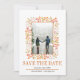 Berries e folhas de casamento outono de laranja queimado na borda Salve o anúncio Data. A frente deste adorável anúncio apresenta um quadro feito de bagas e folhas, o texto "Salvar a Data" em laranja queimado e sua foto. O dorso é de cor laranja sólida queimada.