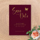 Celebre o seu casamento com o nosso elegante cartão "Burgundy & Gold Script: Glitter Butterfly Wedding Save the Date". Este design requintado apresenta um rico fundo burgundy adornado com uma escrita dourada luxuosa e tipografia moderna dourada para nomes personalizados, data e detalhes. Motivos delicados de borboletas em brilho dourado adicionam um toque de romance e brilho. Perfeito para definir o tom de uma celebração sofisticada e glamorosa, este convite personalizável vai cativar os seus convidados e tornar o dia do seu casamento inesquecível.