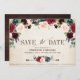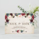 Modelo de cartão de "salve o dia" para casamento floral rústico country sofisticado em tons de vermelho borgonha em aquarela, rosa e azul marinho, com folhagem botânica verde e folhas de eucalipto em fundo de madeira. Este lindo design fácil de personalizar pode combinar facilmente com as cores, estilos e tema do seu casamento e é uma escolha perfeita para casamentos country no outono, verão ou inverno. Você pode encontrar mais designs correspondentes na minha loja ou entrar em contato comigo se precisar de ajuda na personalização do design.