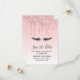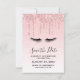 Uma moderna artimanha da moda salva o convite da data. O plano de fundo tem uma imagem de brilho suave ao longo do topo. O resto do fundo é um delicado gradiente cor-de-rosa pastel. Uma ilustração de pestanas pretas completa a design.