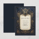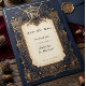 Faça um grande anúncio com este cartão "Save the Date", uma fusão perfeita de heráldica medieval e charme celestial. A paleta de cores azul-marinho profundo e dourado opulento cria um visual luxuoso e sofisticado, enquanto o brasão central com espadas cruzadas e trabalho de pergaminho ornamentado evoca um senso de elegância atemporal. Adornado com motivos celestiais sutis e enfeites florais detalhados, este cartão foi projetado para impressionar. É uma maneira inesquecível de informar aos seus convidados a data do seu casamento, preparando o cenário para uma celebração repleta de romance e charme histórico.