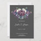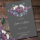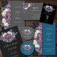Nossa suíte de convite para casamento gótico é perfeita para casais que estão procurando por uma estética escura e melodia. O buquê floral de aquarela é acentuado com flores roxas, violetas e índios, com rosas brancas, dando à suíte um olhar ousado e dramático. O fundo colorido escuro faz as cores pop e cria um contraste espantoso.