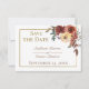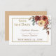O outono é um belo momento para um casamento, e as cores deste cartão Salvar a Data mostram-no. Terras suaves de ferrugem, castanhas, bronzeadas e creme com folhagem verde-úmida e uma falsa borda de ouro. Este cartão, que faz parte do Fall Floral Buquê Invitation Suite de cartas criadas pela Simply Farmhouse Press, também está disponível com a dourada para um olhar mais bonito.