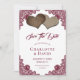 Complemente sua festa de casamento romântica e rustica com este belo casamento burlap e lace salve os cartões de encontro com dois corações burlap em um fundo branco comum decorado com um rendas florais vermelho e burgundy. Itens correspondentes disponíveis.