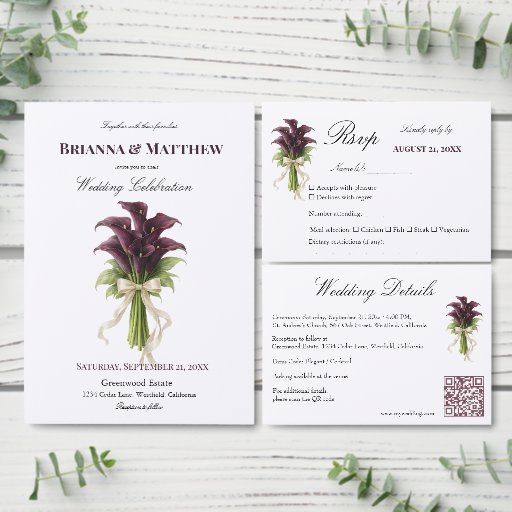An elegant wedding design featuring a refined bouquet of deep burgundy calla lilies tied with a soft ivory ribbon. The composition is balanced, timeless, and carefully detailed, making it ideal for classic and romantic wedding themes.