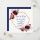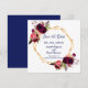 Um casamento elegante e romântico Salve o cartão de Data. Um quadro fino de cor dourada, em forma geométrica, com rosas de cor d'água do estilo boho, flores em burgundy e rosa. Modelos para seus nomes, data e local do casamento. Fundo branco na frente. Marinho de letras azuis. Traseira: fundo marinho azul colorido.