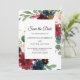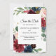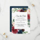 Crie uma primeira impressão duradoura com este cartão de aviso prévio com design rústico, mas refinado, apresentando um fundo azul-marinho rico, flores de burgundy e blush exuberantes e sutil realce dourado. Perfeito para casamentos de outono ou inverno, este cartão personalizável permite que você mostre sua data especial de forma elegante e romântica. Personalize facilmente com nomes, data do casamento e localização para combinar com a estética da sua celebração.