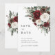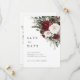 A refined burgundy winter floral save the date featuring rich burgundy roses, soft ivory blooms, and elegant greenery with subtle pinecone details, designed for a romantic and timeless winter wedding aesthetic. The balance of deep burgundy and natural ivory creates a warm, elevated look perfect for cozy holiday weddings, Christmas celebrations, and rustic elegant venues.