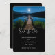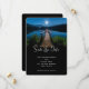 Cartão de salvar a data com uma bela fotografia de um cais de madeira que se estende sobre um lago calmo. Céu noturno coberto de estrelas e uma bela lua cheia.