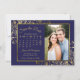 Estes cartões salve a data vão avisar seus amigos e família sobre seu próximo casamento. Eles apresentam um elegante design azul-marinho e ouro com sua foto em um quadro de folha de alumínio azul-ouro e caracóis e espirais delicados nos cantos. Há espaço para um calendário personalizável do seu mês de casamento com um coração à volta do seu dia especial. Rico, na moda, posh e glam, estas cartas são uma maneira maravilhosa de começar a sua viagem de casamento com classe e estilo.