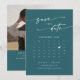 Este calendário de fotos de código QR azul-lacrimogêneo, azul-lacrimogêneo, salva que o cartão de data é perfeito para um casamento minimalista. A ousada joia da turquesa azul-escura do moderno design da boêmia apresenta uma caligrafia rústica simples com um estilo único, mas clássico. Personalize sua data de salvamento com o calendário do mês do seu casamento, com um coração na data do seu casamento, seus nomes, local do casamento, uma foto de noivado e um código QR que liga ao seu site de casamento.