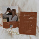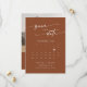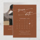 Este calendário de fotos de código QR boho chic terracotta salvando o cartão de data é perfeito para um casamento minimalista. A design boêmica laranja moderna, queimada pela terra, apresenta caligrafia rustica simples com um estilo único, mas clássico. Personalize sua data de salvamento com o calendário do mês do seu casamento, com um coração na data do seu casamento, seus nomes, local do casamento, uma foto de noivado e um código QR que liga ao seu site de casamento.