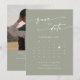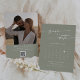 Este calendário de fotos de código de QR verde do sábio boho, salvo o cartão de data é perfeito para um casamento minimalista. A moderna design boêmica verde-luz neutra apresenta uma caligrafia rústica simples com um estilo único, mas clássico. Personalize sua data de salvamento com o calendário do mês do seu casamento, com um coração na data do seu casamento, seus nomes, local do casamento, uma foto de noivado e um código QR que liga ao seu site de casamento.