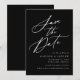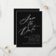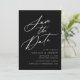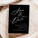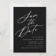Elegante salve a data com "Salvar a Data" exibida em um script de caligrafia branca com um fundo preto. Personalize a caligrafia, salve a data com seus nomes, data e local do casamento e site do casamento. A design não-fotográfica coordena-se com a nossa coleção de casamento Elegante Calliografia.
