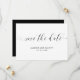 Uma tipografia Salve a Data com caligrafia preta com baloiços e corações sobre fundo branco. A parte de trás é preta e pode ser alterada para qualquer cor que desejar. O layout simples e mínimo e muito espaço aberto dão a esta design um toque moderno e a letra caligráfica e os corações lhe dão uma reviravolta romântica.
